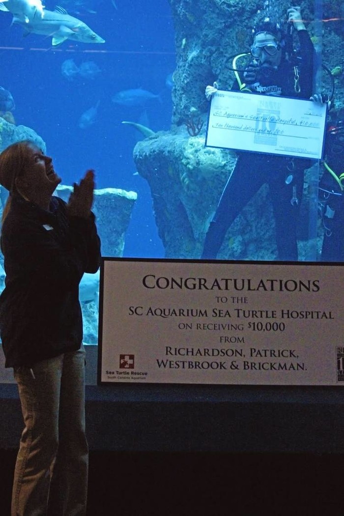 Richardson, Patrick, Westbrook & Brickman surprised South Carolina Aquarium’s President and CEO Kevin Mills and volunteer staff with a $10k donation to the Sea Turtle Hospital during a never-before-seen underwater check presentation at the Great Ocean Tank as part celebration of the firm’s 10-year anniversary. RPWB has given $5,000 to a different area non-profits each month this year through September. In October, the Charleston-area community voted online for which non-profit they wanted to see receive an additional $10,000 from RPWB.