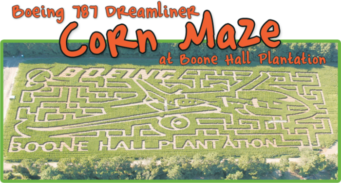Continuing a tradition of shaping the annual corn maze around the logos and words of sponsors, this year's maze of flattened and non-flattened corn stalks at Boone Hall Plantation sports Boeing's logo and the design of a 787 Dreamliner.