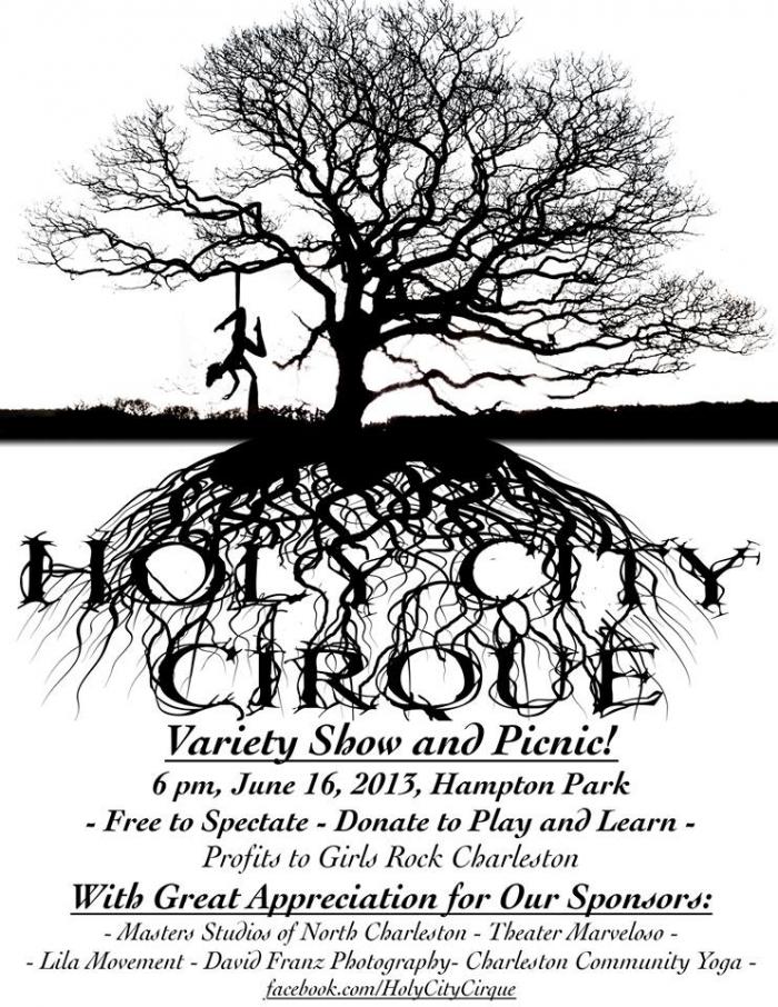 Holy City Cirque, a “collective of aerialists, acro yogis, fire spinners, face painters, and hoopers” will host a variety show benefiting Girls Rock Charleston on Sunday, June 16th at 6 pm. The event will be held at Hampton Park.