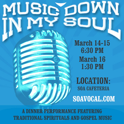 The Charleston County School of the Arts Vocal Department would like to invite you to their 2nd annual dinner concert in March. Join the 175 member Middle & High School Vocal Department for the "Music Down In My Soul" dinner concert featuring traditional spirituals, inspirational and toe-tapping gospel music, with LIVE cd recording! (CD pre-order forms will be available at the event.) Menu: fried chicken, macaroni and cheese, green beans, cornbread and banana pudding, tea and water Location: Charleston School of the Arts Cafeteria 5109 W Enterprise St, North Charleston 29405 Dates: Friday and Saturday, March 14 and 15 at 6:30pm Sunday, March 16 at 1:30pm Admission: $15 for Adults, $10 for Students, Senior Adults, and Groups of 10 or more. Seating will begin 30 minutes prior to event time. Tickets can be purchased at SOAvocal.com under Tickets or for inquiries, call 843-529-4990.
