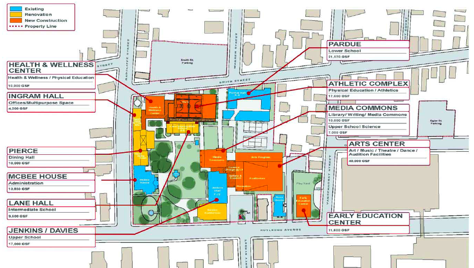 The construction plan calls for several new buildings: A 10,000-square-foot health center at Smith and Radcliffe streets. A 17,600-square-foot athletics complex next to the health center. A 40,000-square-foot three-story arts center near Jenkins Hall with room for art, music, theater and dance. An 18,000-square-foot, three-story media commons with library and science facilities also near Jenkins Hall. An 11,000-square-foot early education center on Rutledge Avenue.