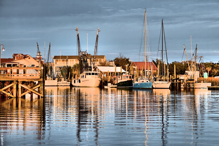 Image by Monte @MDG-Graphix.net A row of Shrimp boats is seen at the recently improved Shem Creek park. The legacy of shrimp boats on the creek is a long one, but has greatly diminished in recent years.