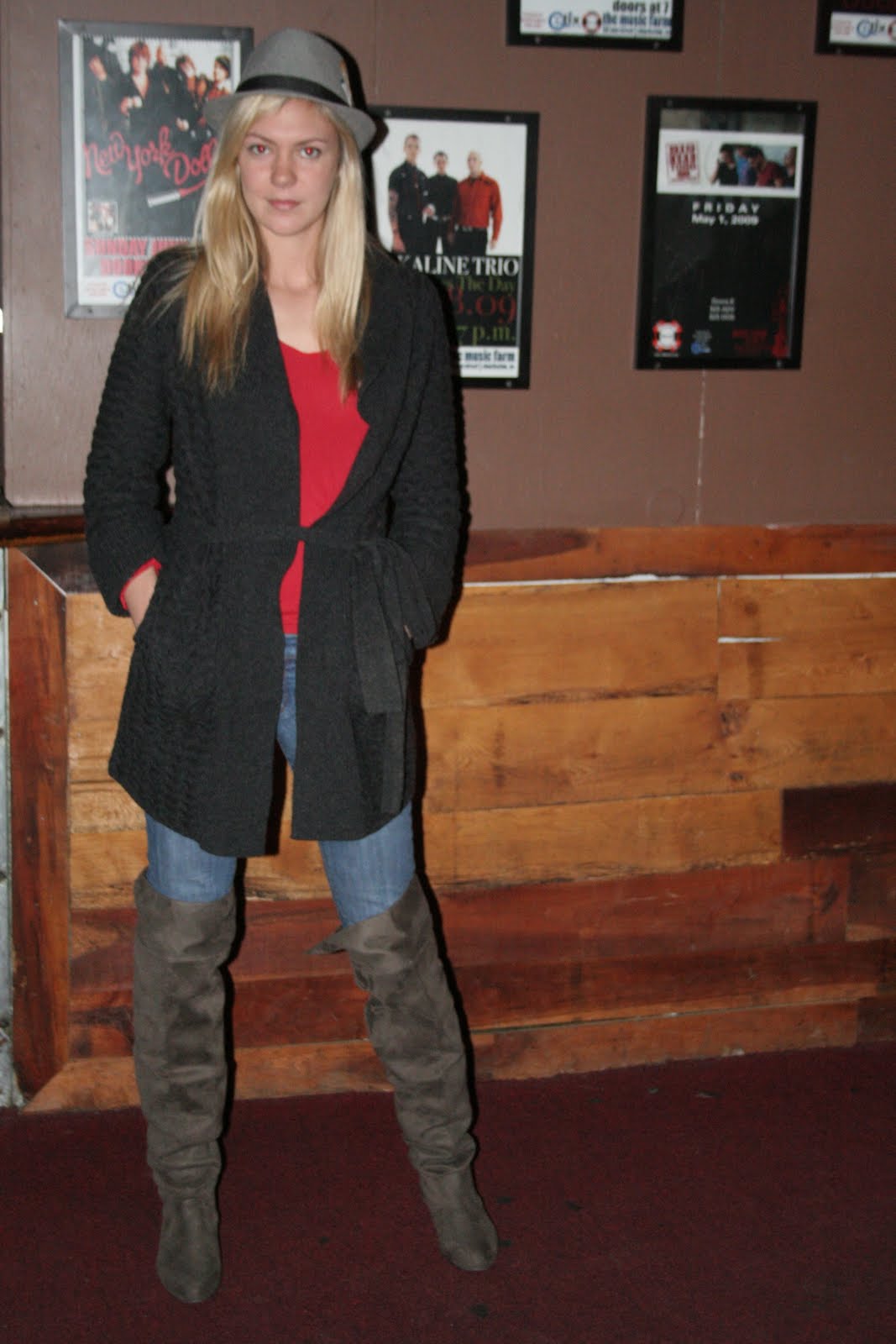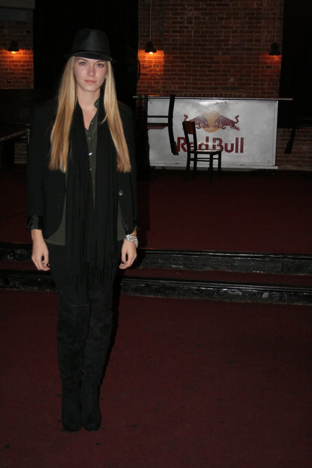 Designer Jamie Lin Snider (left) and model. Fedoras were apparently the headwear of choice Sunday night. Like the deep burgundy color of Snider's, as well as the ample wrist and finger jewelry.