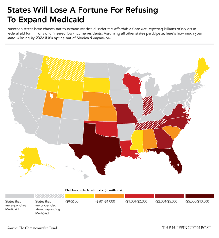 Following a 2012 Supreme Court ruling that made Medicaid expansion under the Affordable Care Act optional for states, 20 states have opted out of the reform, rejecting billions of dollars of federal funding for low-income residents [...] If adopted by all states, the Medicaid expansion -- designed for residents at or below 138 percent of the federal poverty level -- is projected to provide 21.3 million Americans with affordable health care by 2022 while reducing states' uncompensated health care expenses.