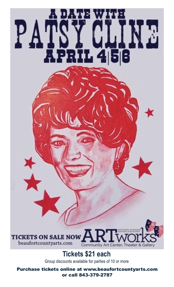 4/4 – 4/6, “A Date With Patsy Cline”, Actress Maggy Norden transforms into Patsy Cline for a performance which combines the well known and loved music of Patsy Cline with snippets of dialogue which reveal details about the singer’s personal life. Whether you are a longtime fan of Patsy Cline’s music or just discovering her, this show will leave you “Crazy” for more. Tickets are $21/each with group discounts available for parties of 10 or more. Tickets can be purchased online at www.beaufortcountyarts.com or by calling: 843-379-2787
