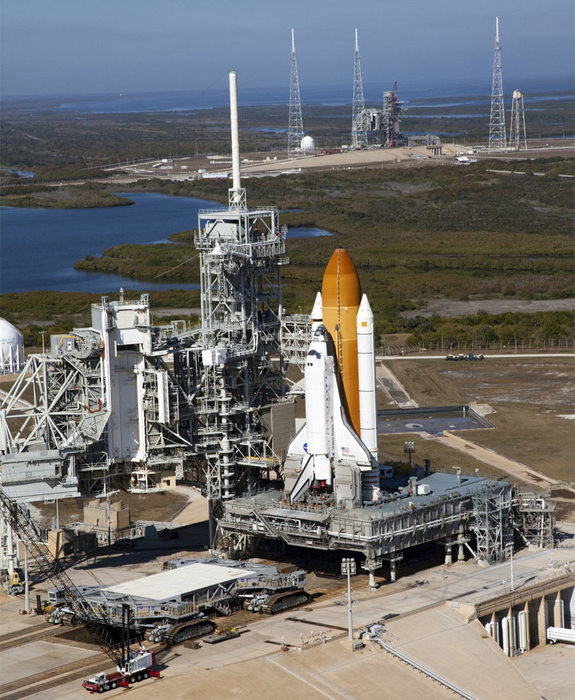 First reporting: The Space Shuttle Discovery is set to launch at the Kennedy Space Center at 4:50 p.m. today, and if you look eastward from Beaufort about a minute after launch you should be able to catch a glimpse of the smoke contrail.