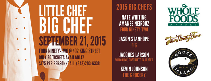 Charleston, S.C. (July 16, 2015) – Five of Charleston’s most celebrated chefs partner with local children from the Louie’s Kids program to host the 7th Annual Little Chef, Big Chef fundraising competition. The event, presented this year by Goose Island Brewery, Whole Foods Market and Motley Rice, with additional sponsors Southern Eagle Distributing, New Country Kickin' 92.5, KW Associates and Coastal Cupboards will be held on September 21, from 7 – 10 p.m., at Four Ninety-Two. Proceeds from the event benefit Louie’s Kids, a national nonprofit treating childhood obesity through promotion of a healthier more productive lifestyle.