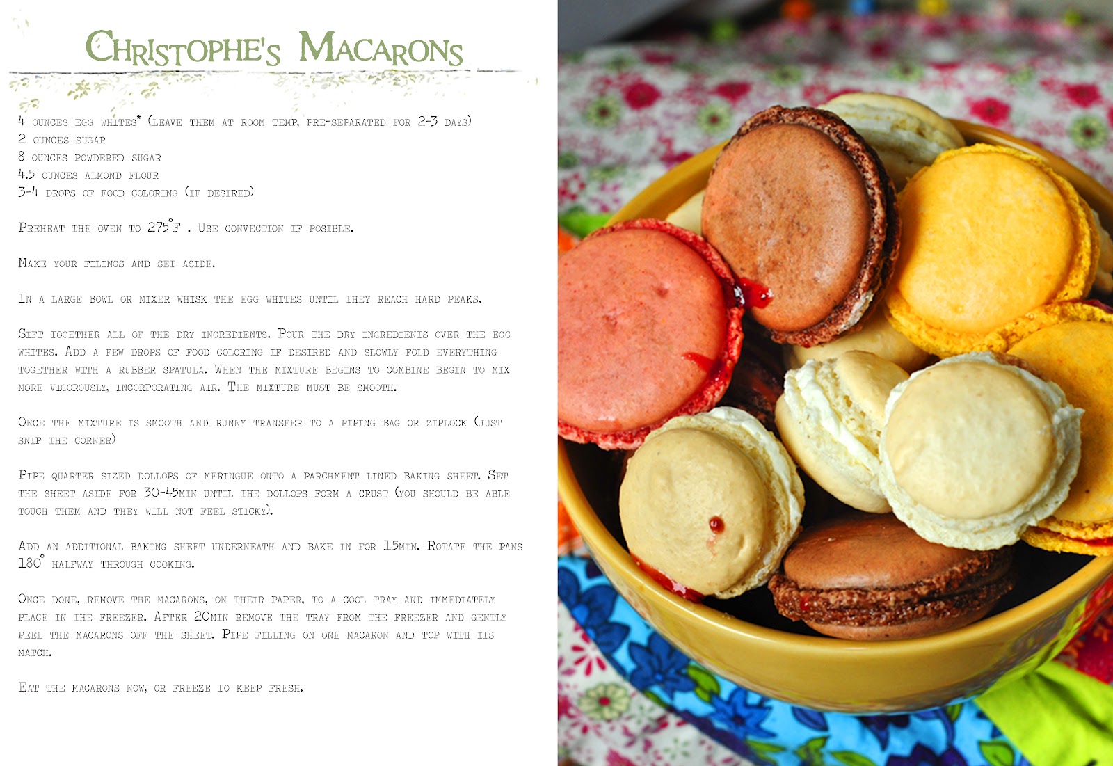 Christophe explained that one of the secrets to making the macaron is leaving the separated egg whites out at room temperature for 2-3 days before using them. Some of you may shy away from this step because we Americans always refrigerate our eggs in fear of salmonella or some-such unseen invader. When I moved to Paris I had to phone my mother to ask if it was safe to eat the eggs because in France eggs are never refrigerated. I basically was forced to adopt the habit to save space in my tiny Parisian apartment's tinier fridge. If you remember that a chicken sits on an egg for days without it going bad, then you realize room temperature can't hurt an egg. Refrigeration just keeps them fresh for longer.