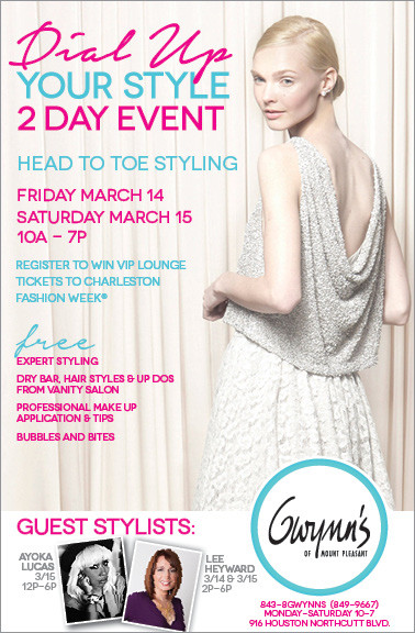 This is a fashionable event you do not want to miss! For more information, visit http://gwynns.com/happenings/dial-up-your-style/ or call the store at (843) 849-7990.