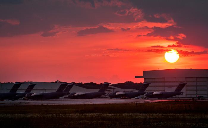 C-17 Globemaster IIIs sit on the flight line as the sun sets May 9 at Joint Base Charleston. The C-17 is designed fro rapid delivery of troops and many types of cargo directly to forward bases.
