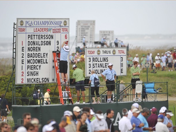 Image by Edward M. Pio Roda/PGA.com A leaderboard at the PGA Championship at The Ocean Course on Kiawah Island.