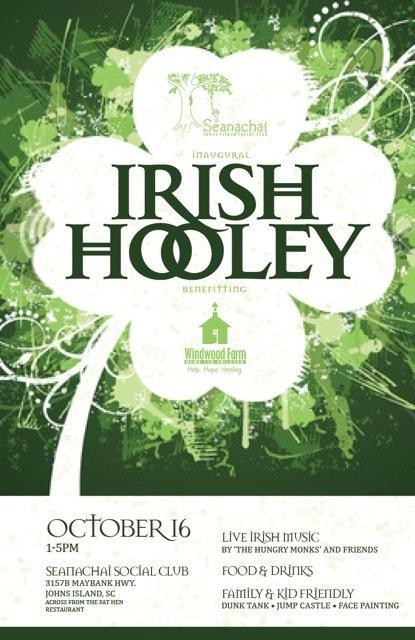 Celebrate at the inaugural Irish Hooley at the Seanachai Social Club on Johns Island, Sunday October 16th from 1-5pm. Open to all guests and family friendly. Dunk Tank, Face Painting, Jump Castle, Toss the Welly Competition. Charleston Crepe Co. and Stonebreaker's Pizza to benefit Windwood Farm Home For Children.