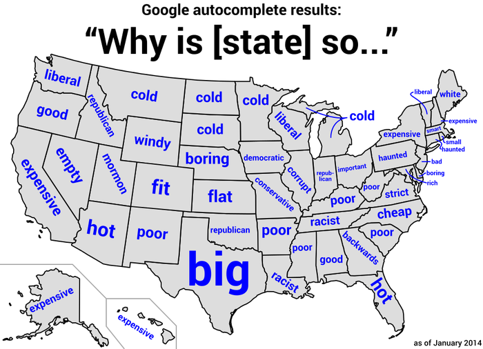 People have been having fun with maps and Google autocomplete lately. And the above, "Why is [state] so..." is the newest to come.