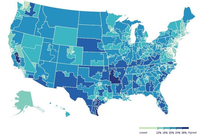 "The map above, from Oxfam's report, "Working Poor In America," breaks the U.S. into congressional districts and analyzes the percentage of workers in each district who would benefit from raising the minimum wage to $10.10 from its current $7.25 an hour, as President Barack Obama has proposed. On average, 19 percent of workers fall in this category. "